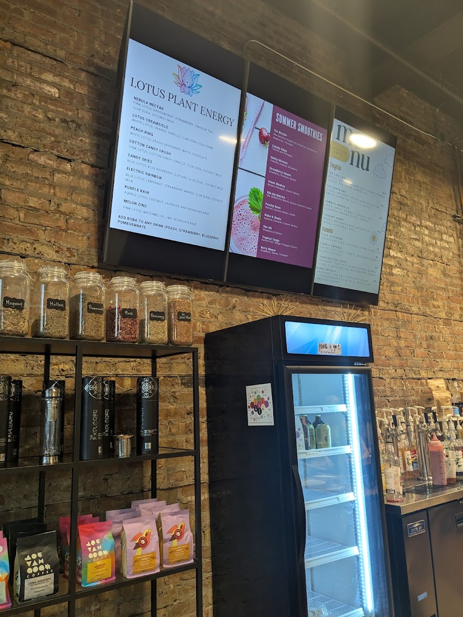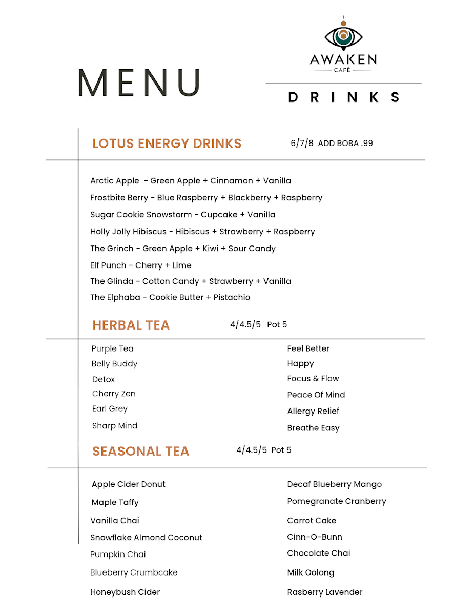 The menu at Awaken Cafe offers a variety of beverages and retail items catering to different tastes and needs. It is organized into several main categories, including herbal teas, energy drinks, and miscellaneous retail products.